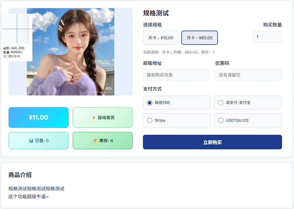 允许商家为商品设置多个规格(如颜色、尺寸、版本等),并为每个规格组合设置独立的价格、库存等信息。该功能支持自动发货和手动处理两种模式,与卡密系统深度集成,自动计算库存。