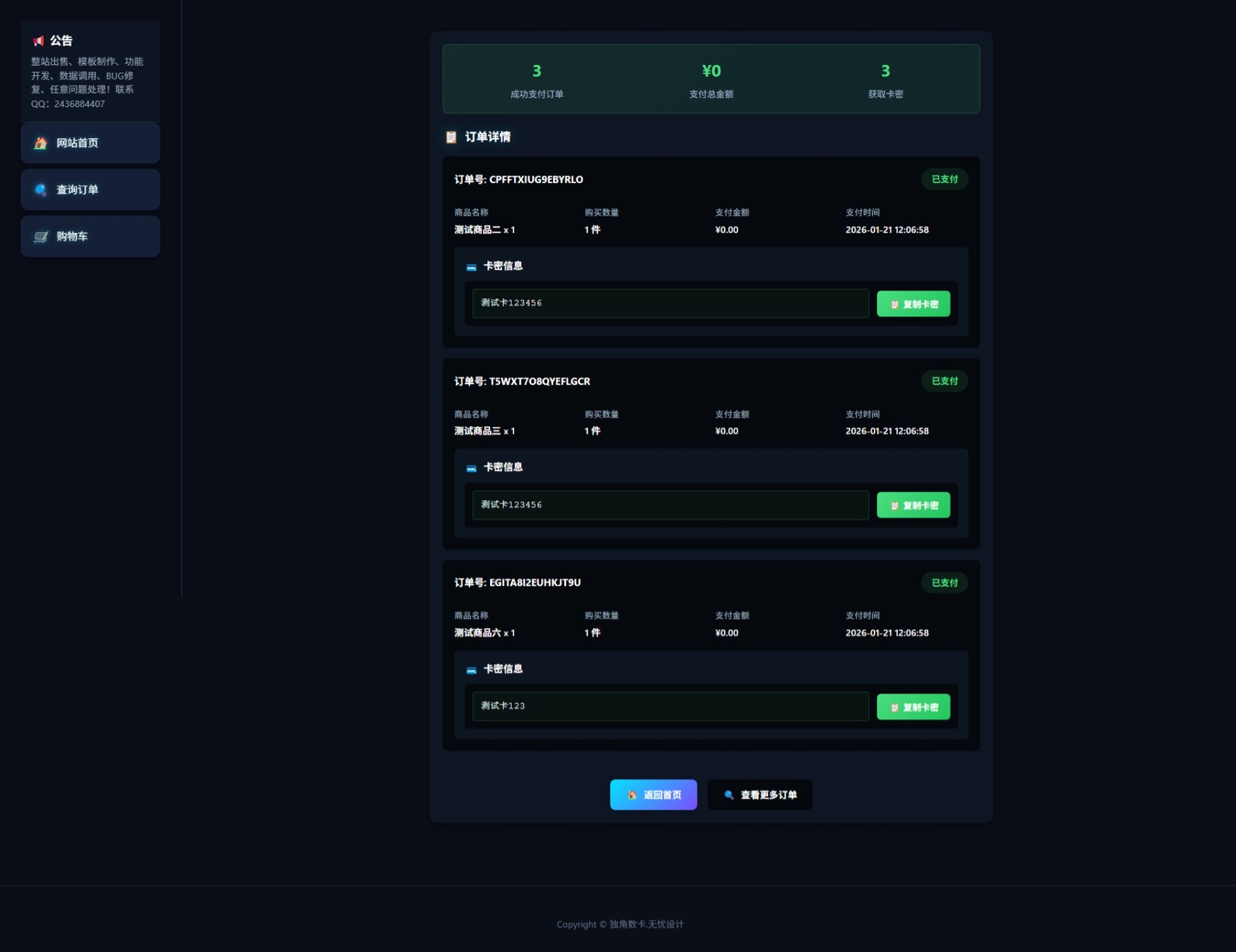 专业的数字商品销售网站搭建服务,支持自动发卡、订单自动处理、在线支付集成,帮助您快速构建独立的软件激活码、会员订阅、虚拟资源等数字产品商城。
