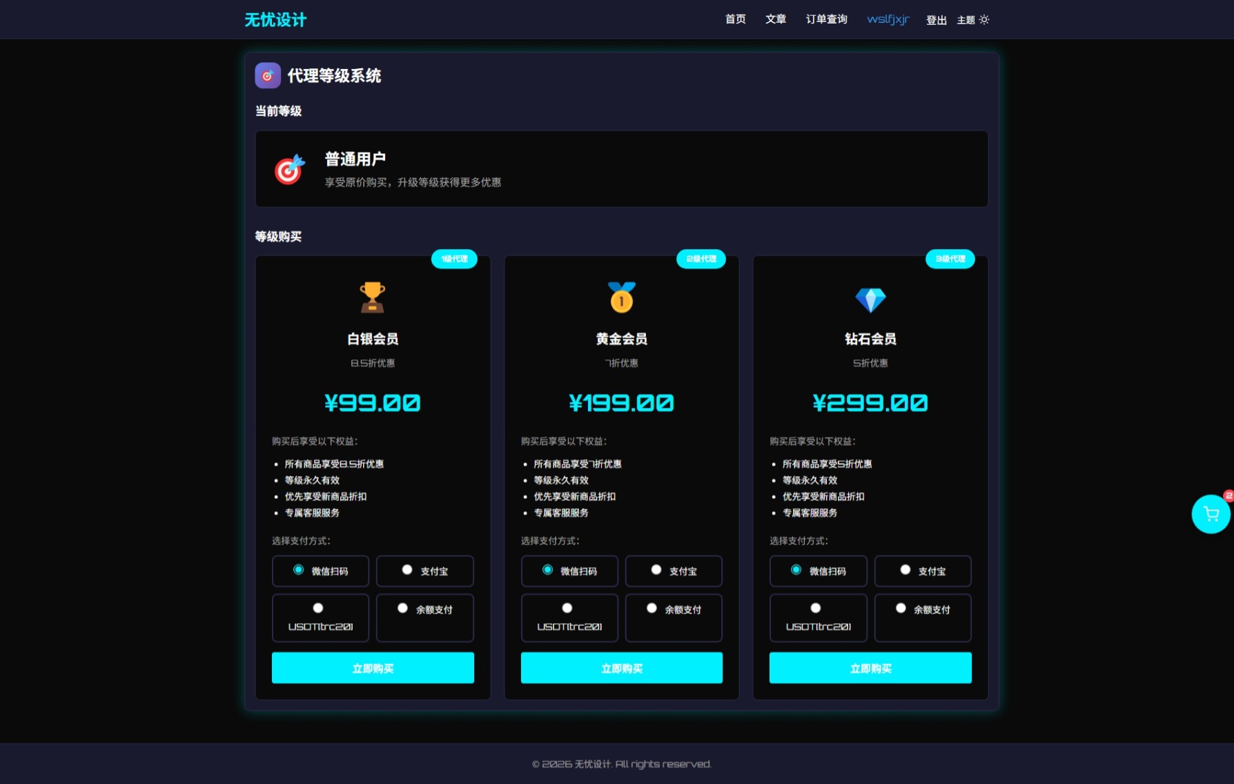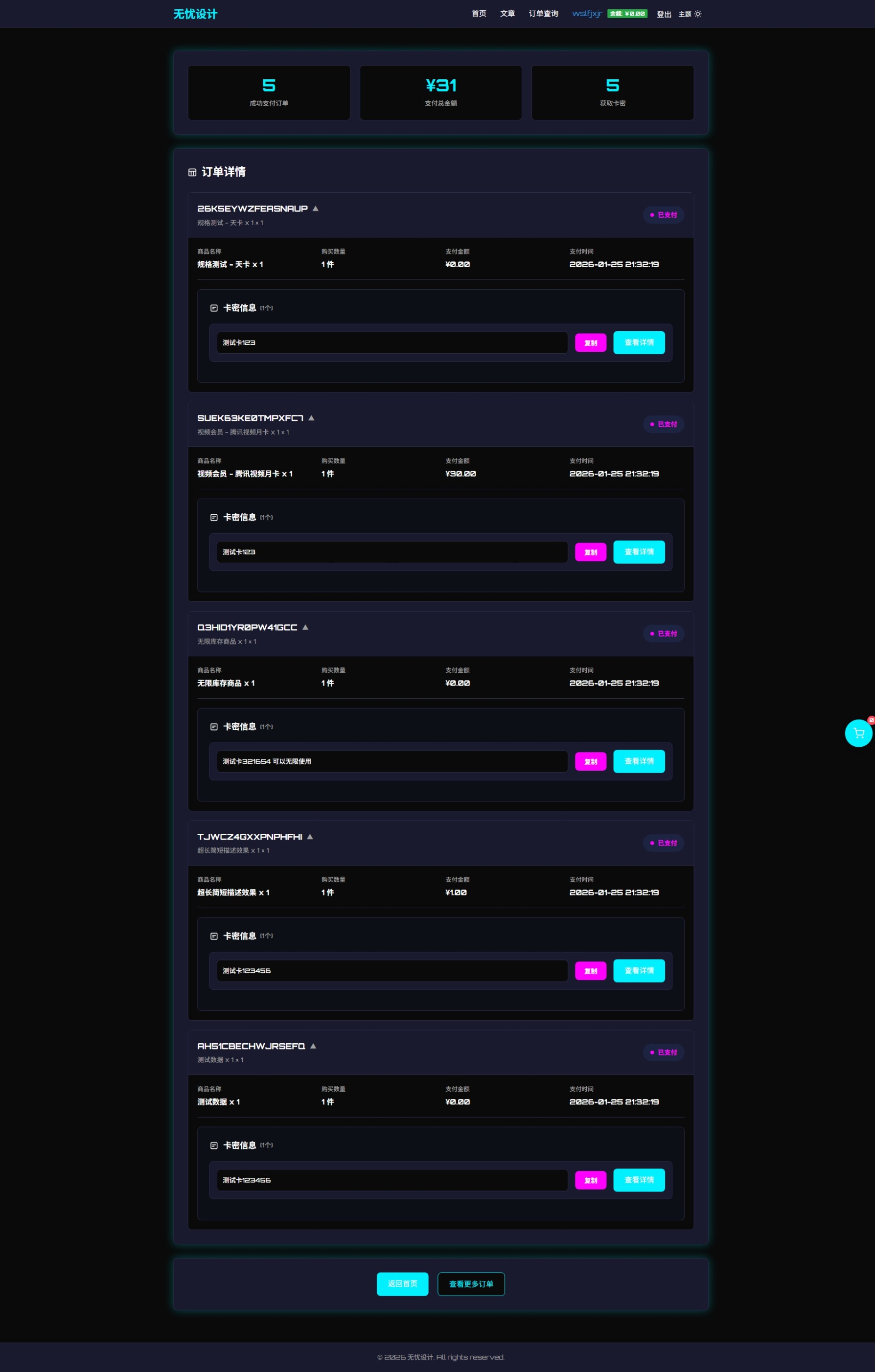 支持不同规格商品如天卡,月卡等 支持密码访问商品 全站任意商品订单号访问商品 特定商品订单号访问商品