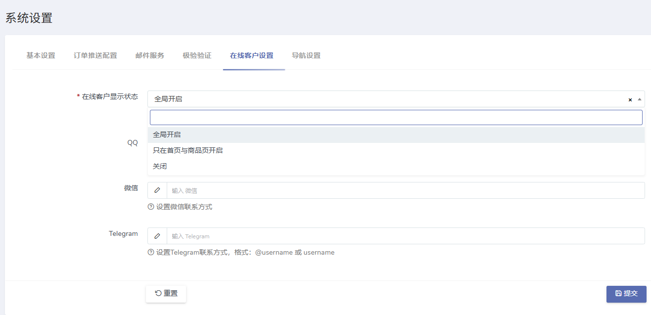 - 在线客户 :支持微信、Telegram等联系方式,可配置显示方式