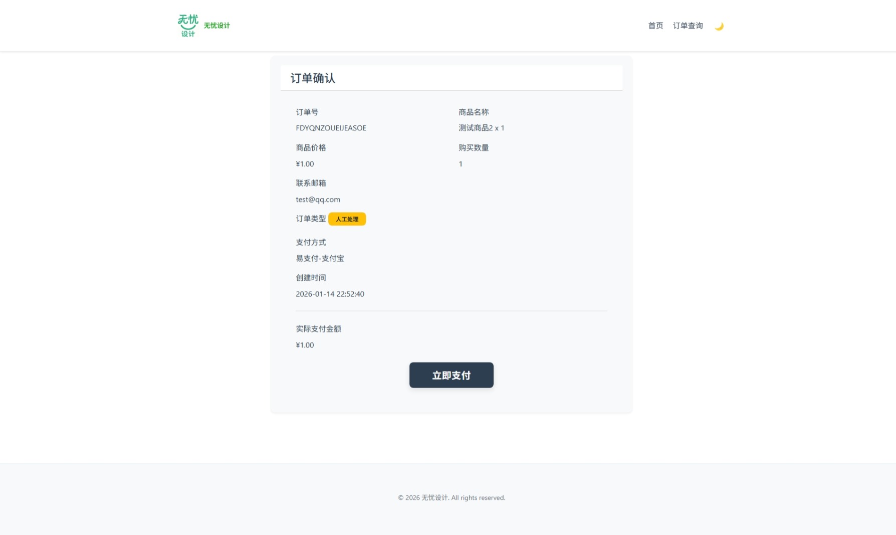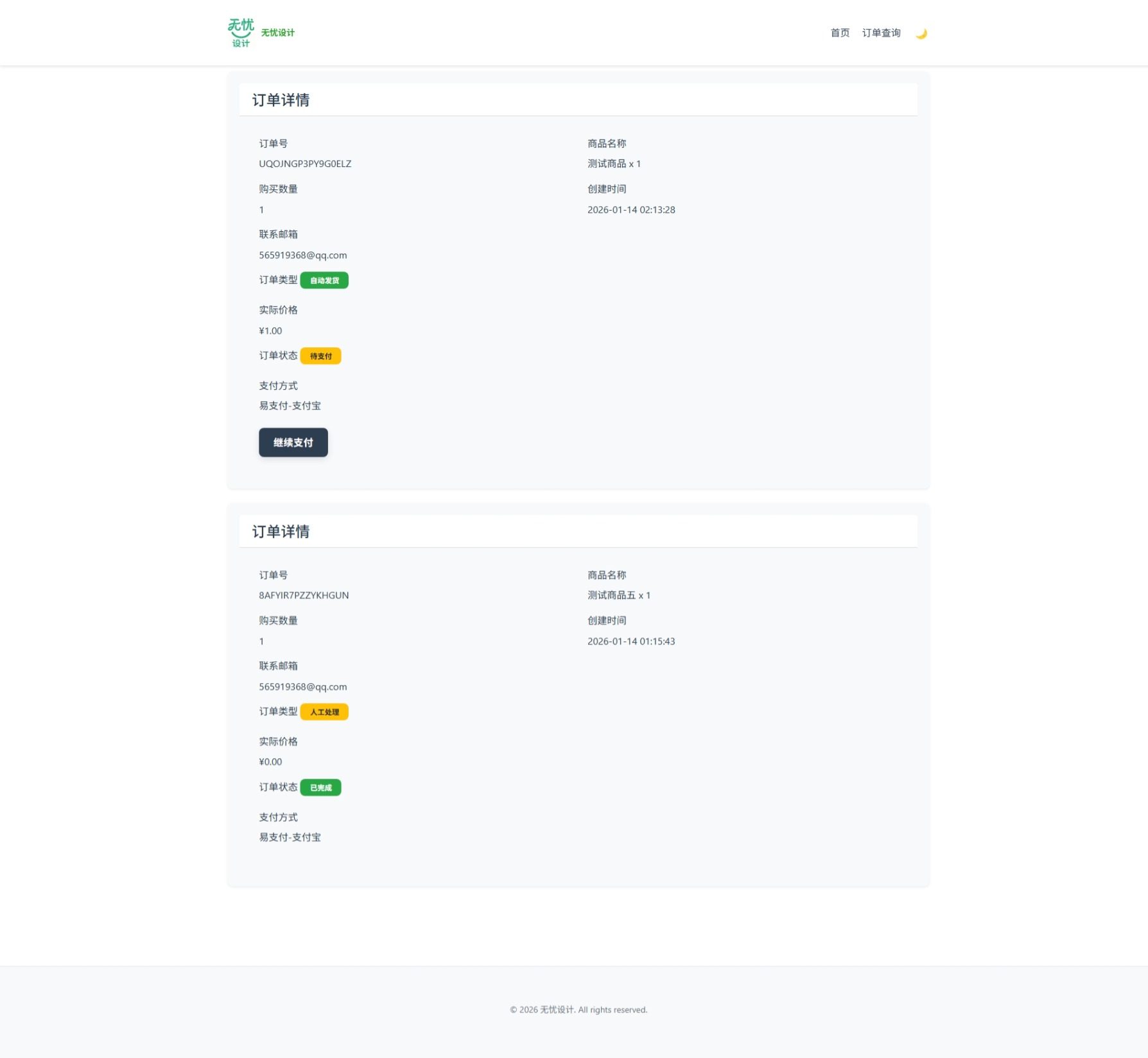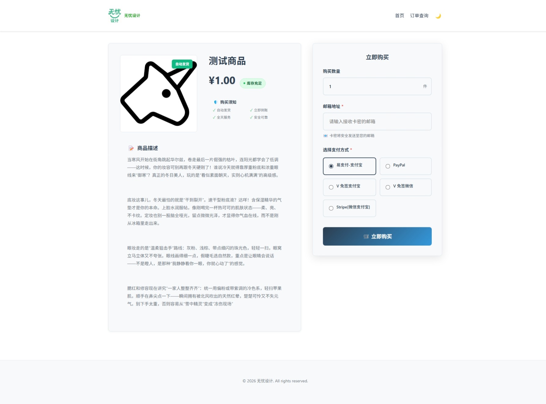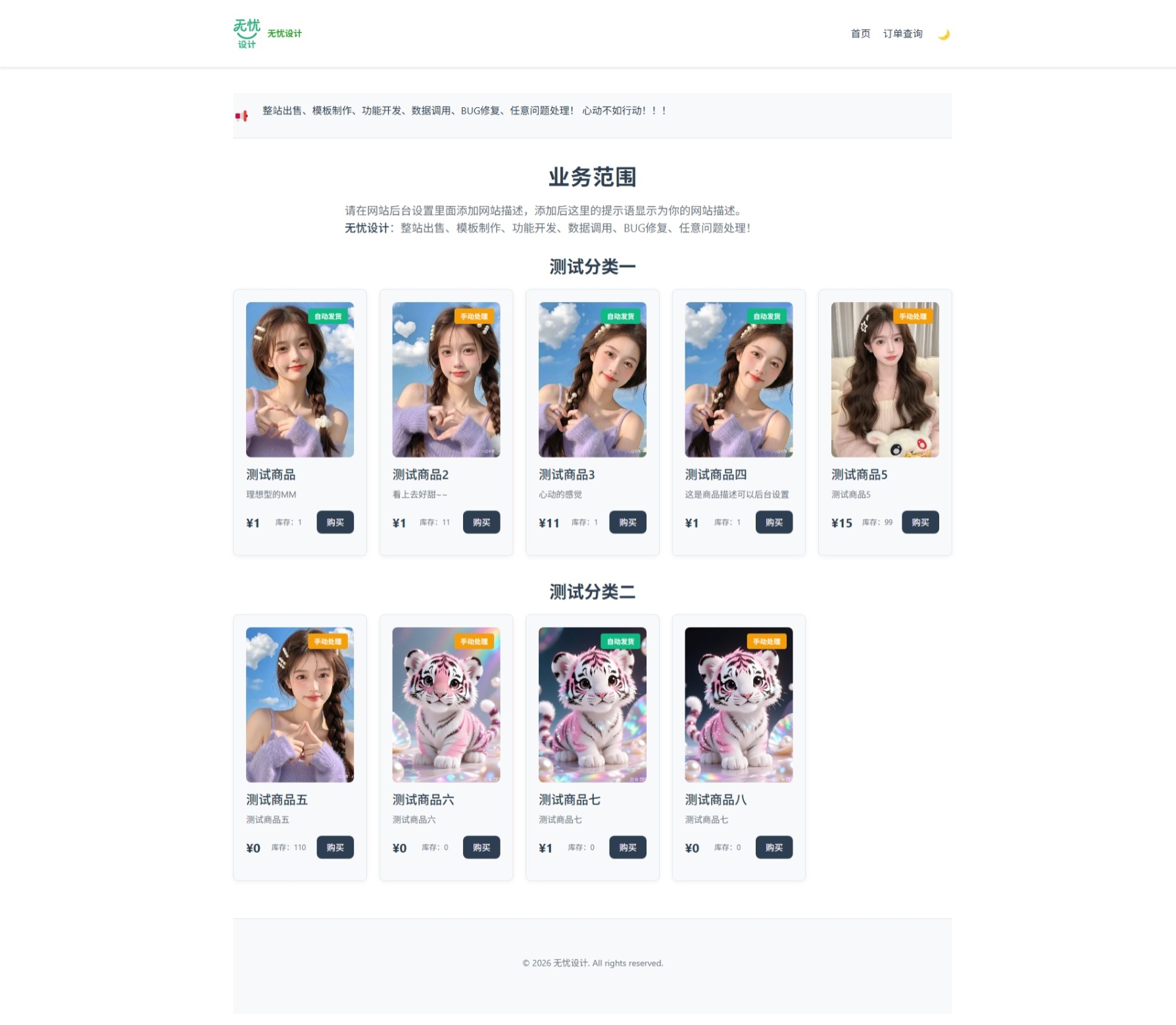 页面 功能 首页 公告展示、商品分类、商品卡片列表 购买页 商品详情、库存状态、购买表单、支付方式选择 订单查询 订单号输入、密码验证、订单状态显示 订单详情 订单完整信息、支付状态、卡密内容 二维码支付 支付二维码展示、金额显示、自动刷新 错误页面 404页面、通用错误页、友好提示